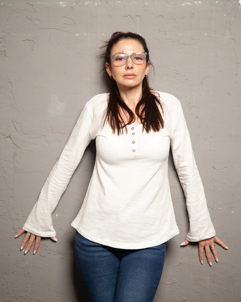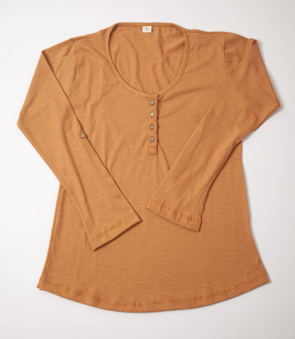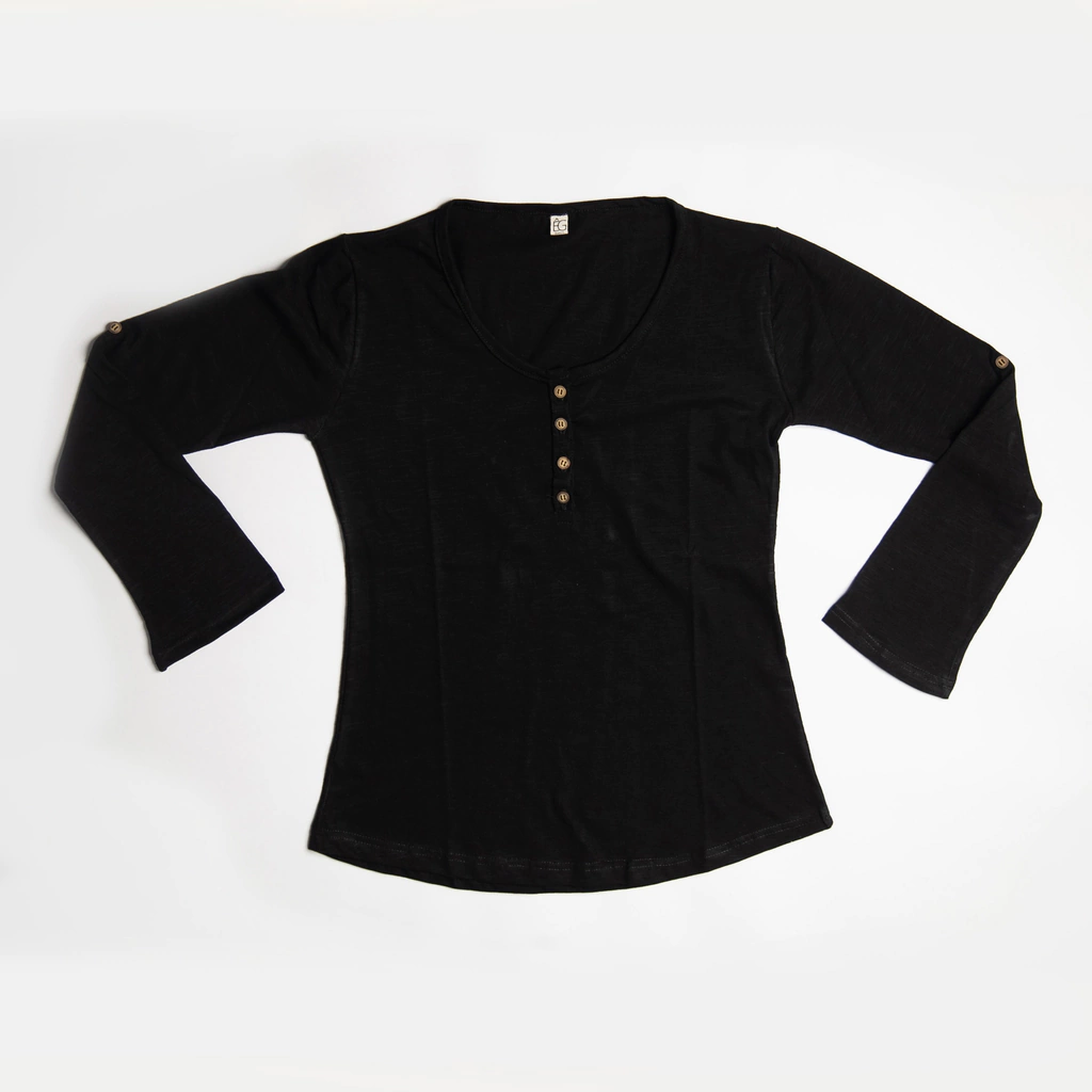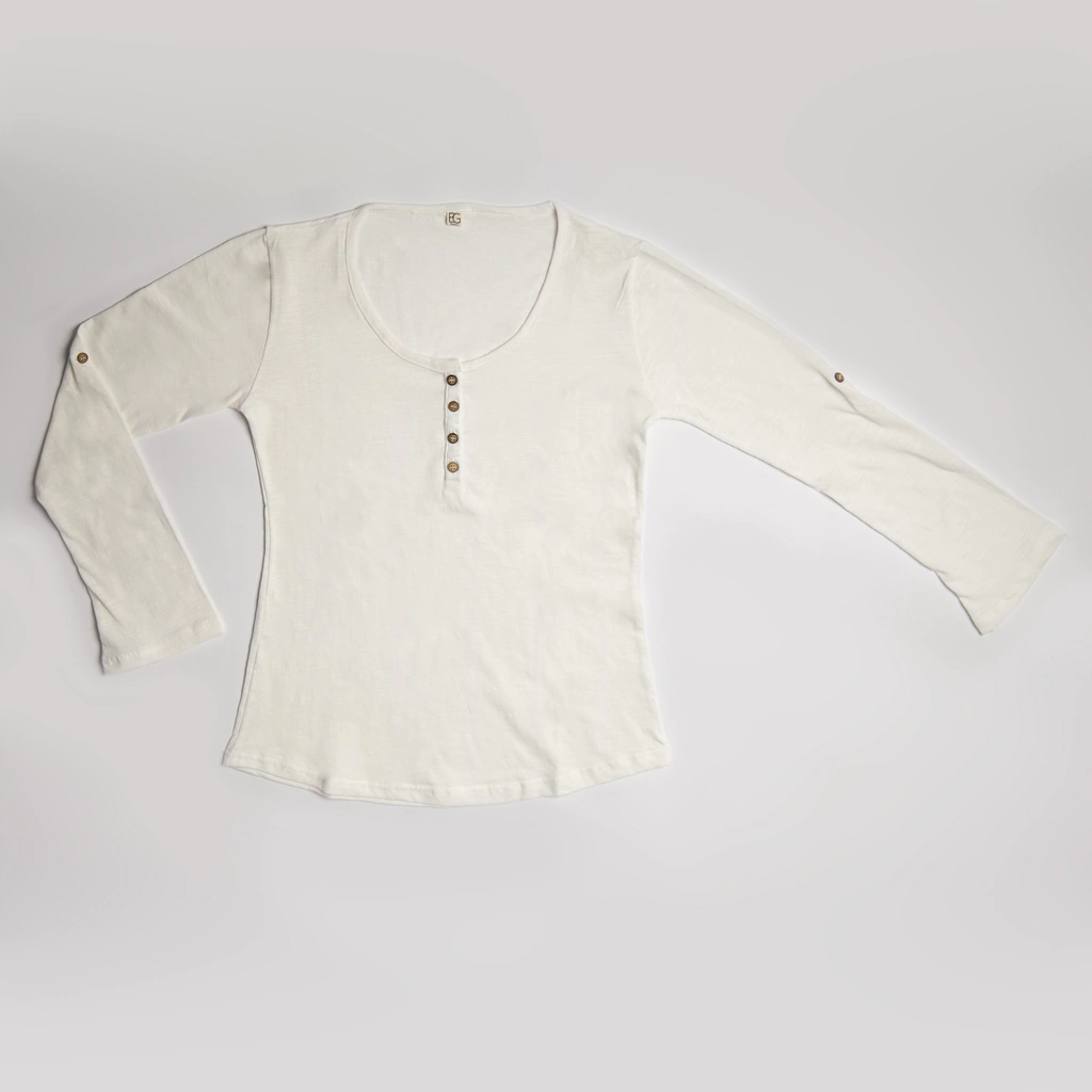 Manga larga, opción 3/4 ya que puede arremangarse y abrocharse por un botón ubicado a la altura del codo.