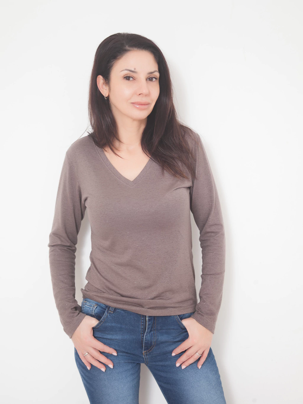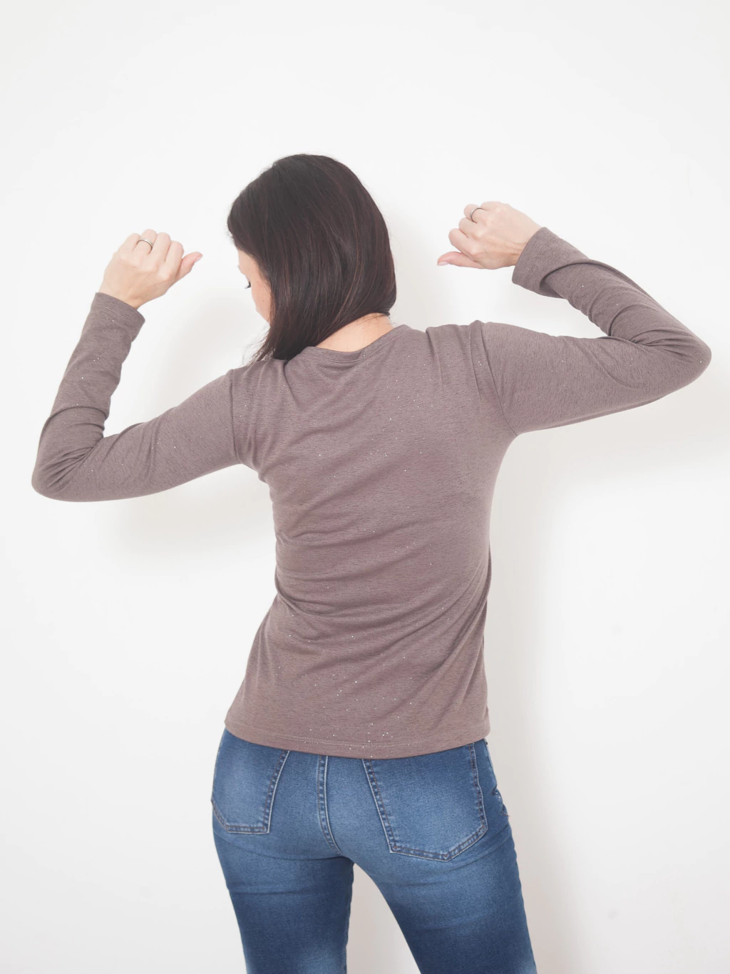 Color habano, con suaves destellos de brillo que aportan ese toque diferente a una prenda clásica.